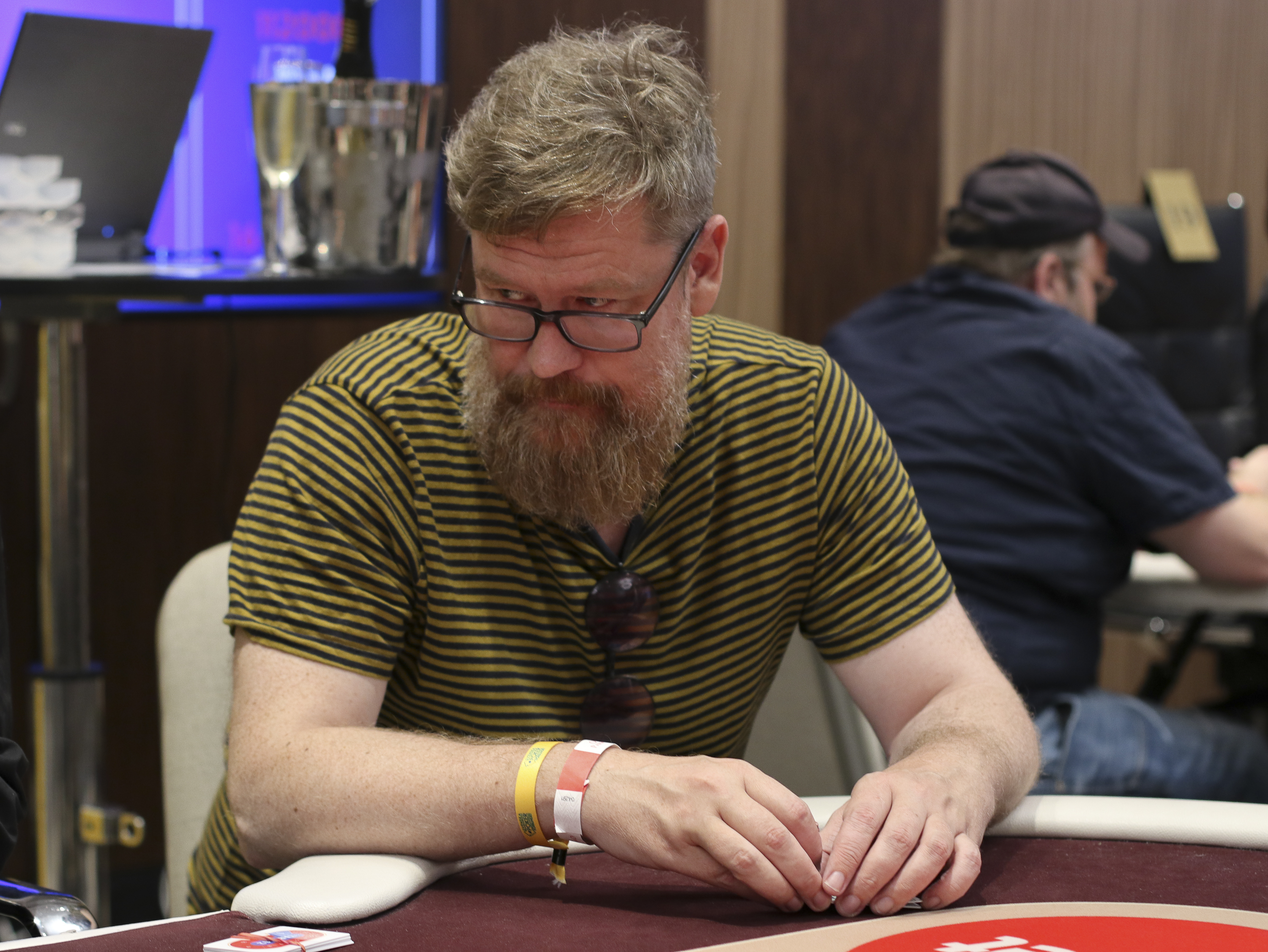 Micke Hedberg från klubben Pokersberga satte sig efter middagspausen med 27k i stacken. Han har