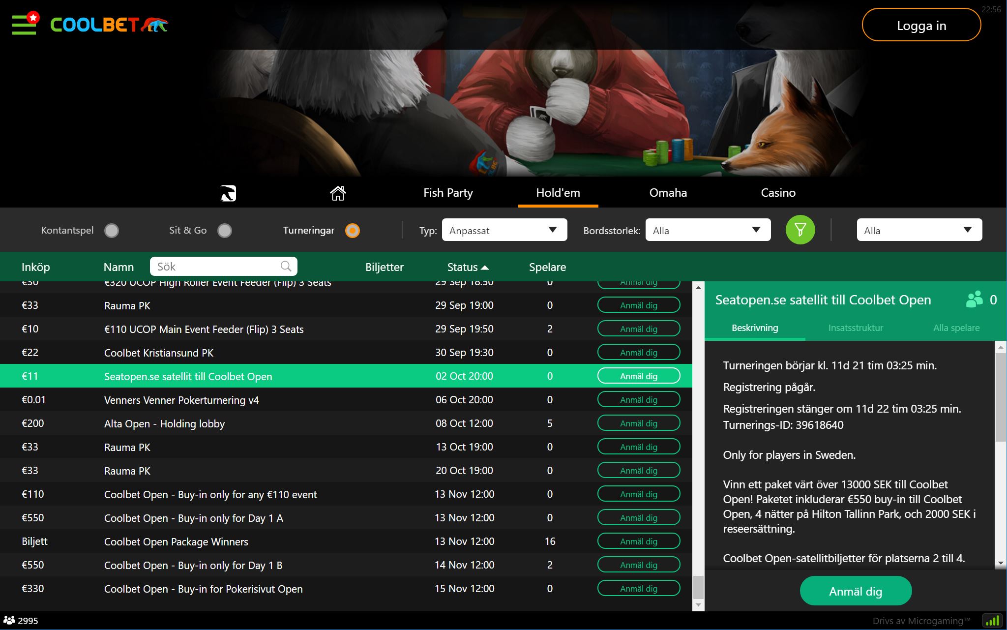 Satelliten spelas onsdag 2 oktober kl.20.00, inköp €11 med en tillåten rebuy de första 60min.