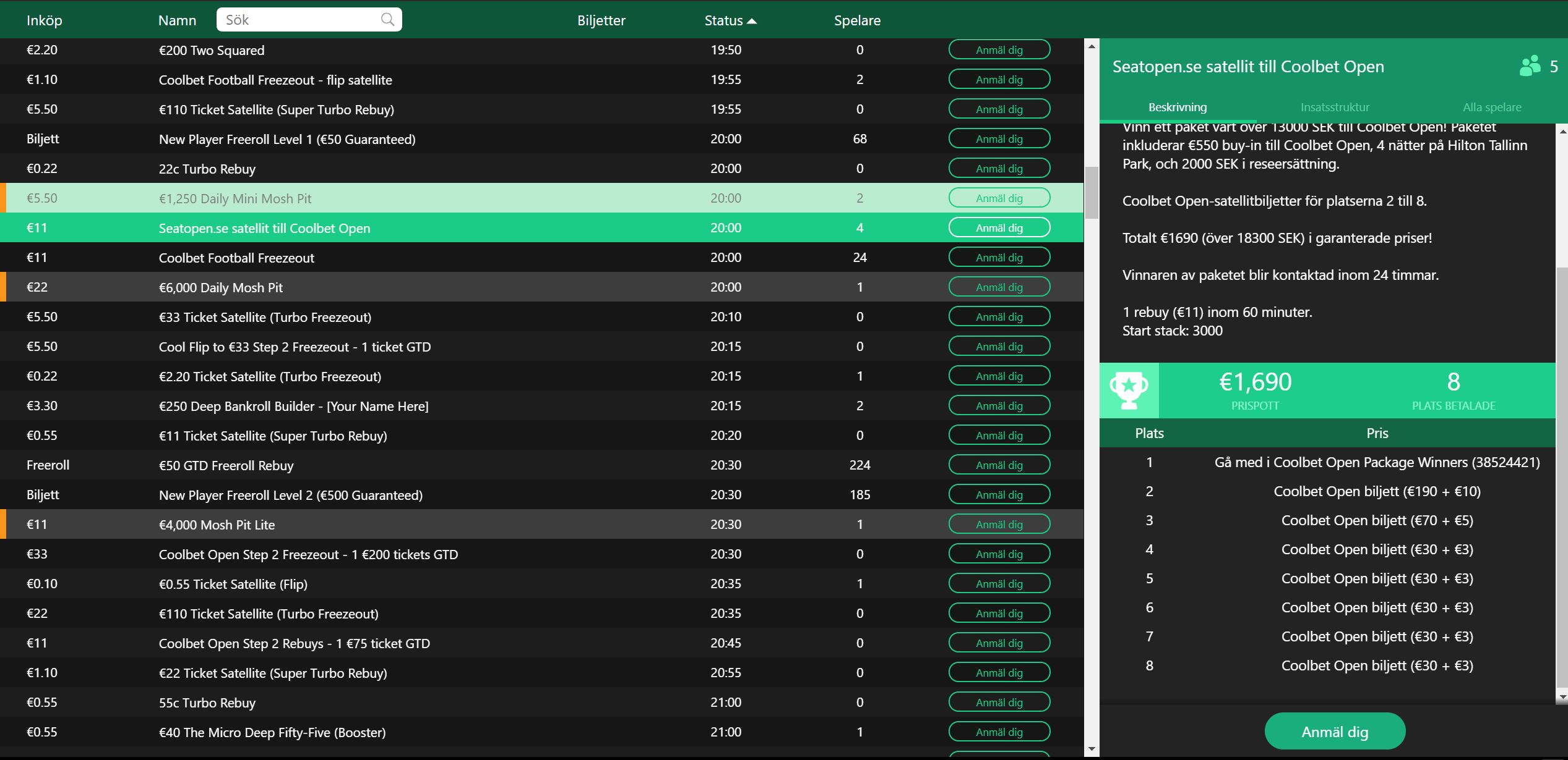 Satelliten spelas ikväll, onsdag 9 oktober kl.20.00, inköp €11 med en tillåten rebuy de första 60min.