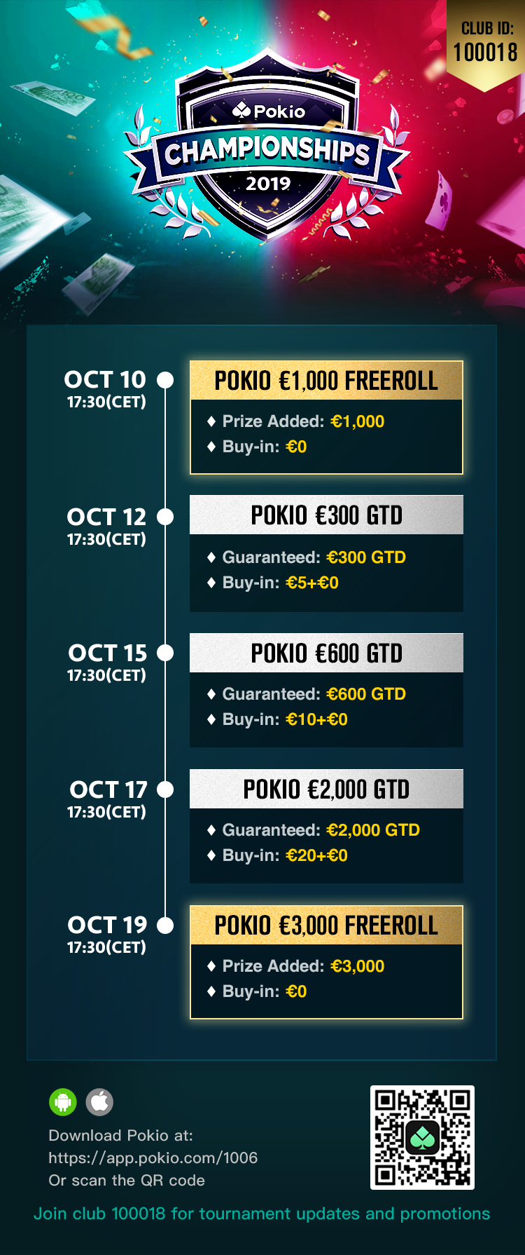 Idag, torsdag 10 oktober kl.17.30 drar Pokio Championships 2019 igång. Spana in turneringsschemat nedan med närmare €7000 i garanterade prissummor och freerolls.