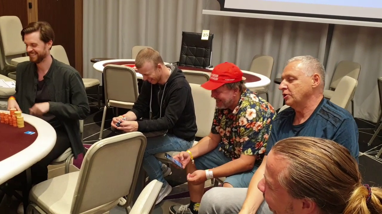 Nu är vi 14 timmar in i turneringen och jag sov tre timmar förra natten. Som tur är så blir det lite hejaklack runtom och det är nog ett gäng på 10-15 pers som sitter brevid och hejar på med friskt humör innanför västen. Per Hildebrand kommer och livekommenterar som om han jobbade på radiosporten, fantastiskt roligt och jag och GB kan inte hålla oss för skratt trots att vi spelar stora viktiga potter.